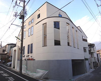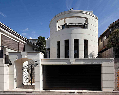 西側道路間口に対して奥に(東西に)長いお敷地条件のため、日当たりなどには有利な反面、都内の1種高度北側斜線制限をもろに受ける外観を、いかに隠すかがメインテーマであり、今回は手前にRの壁を張り出させるデザインをお勧めいたしました。