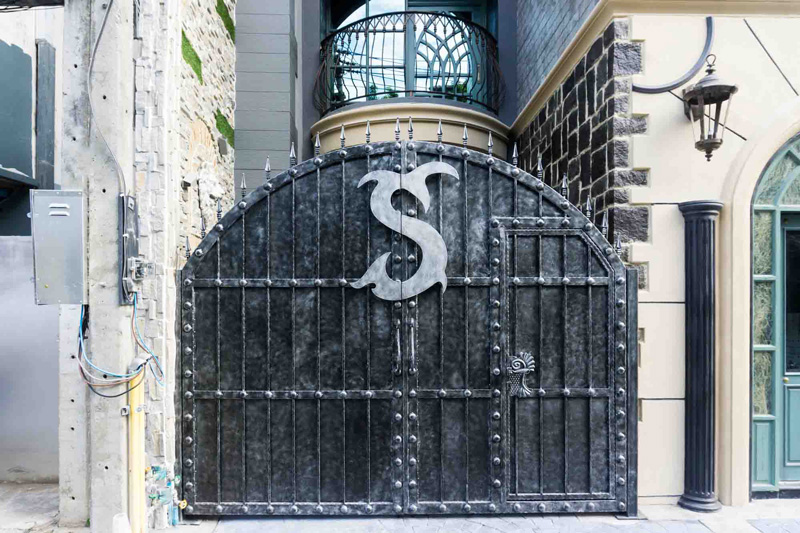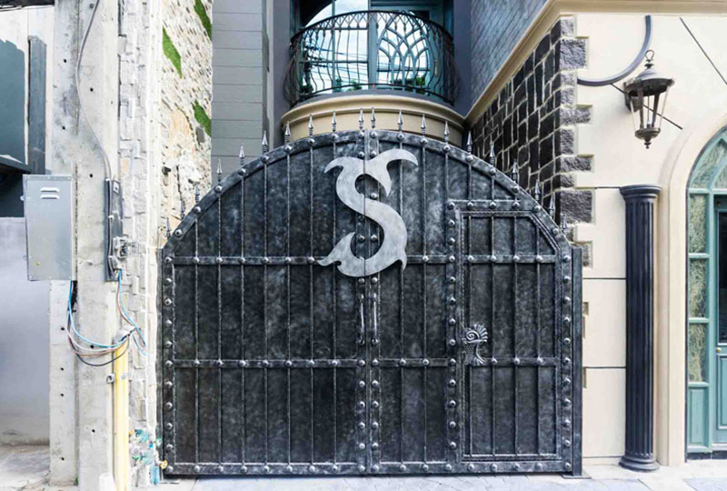 このロートアイアンの門扉・門・ゲートでは、店舗ブランド名の頭文字「H」を、アールヌーボー調でフランスをイメージしたおしゃれな字体で、フレームごとダイナミックに曲げて扉いっぱいにデザインすることで、他では見ることの出来ない唯一無二のオリジナリティあふれた世界観を演出しています。