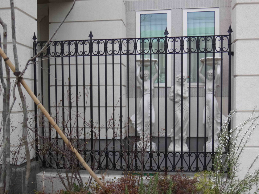 このロートアイアンのフェンスであれば、ベースとなる邸宅・店舗のデザインや、外構・エクステリアのデザインを邪魔することがありませんので、なるべくフェンスの存在感を消して他を目立たせたい時などには、とても重宝すると思います。