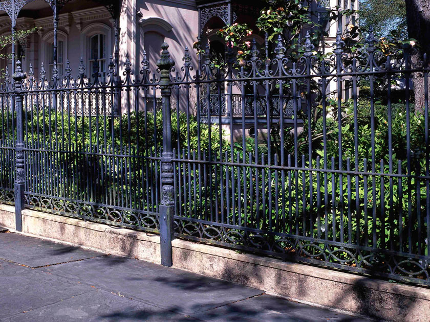 ロートアイアンのフェンス・格子#004は、縦格子をベースにした非常にシンプルなデザインの中にも、ロートアイアン伝統の装飾を控え目に配置するとともに、その装飾もモダン柄寄りにすることで、ヨーロッパの雰囲気でも少し固めな方向性を醸し出したフェンスです。どこかと言えば、ドイツを思い浮かべるイメージでしょうか。