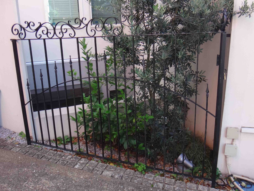 ロートアイアンのフェンス・格子#005は、縦格子をベースにした非常にシンプルなデザインの中にも、ロートアイアン伝統の装飾を控え目に配置するとともに、中央部のフレームをラウンドさせることによって、ヨーロッパの雰囲気を大人しく醸し出したフェンスです。