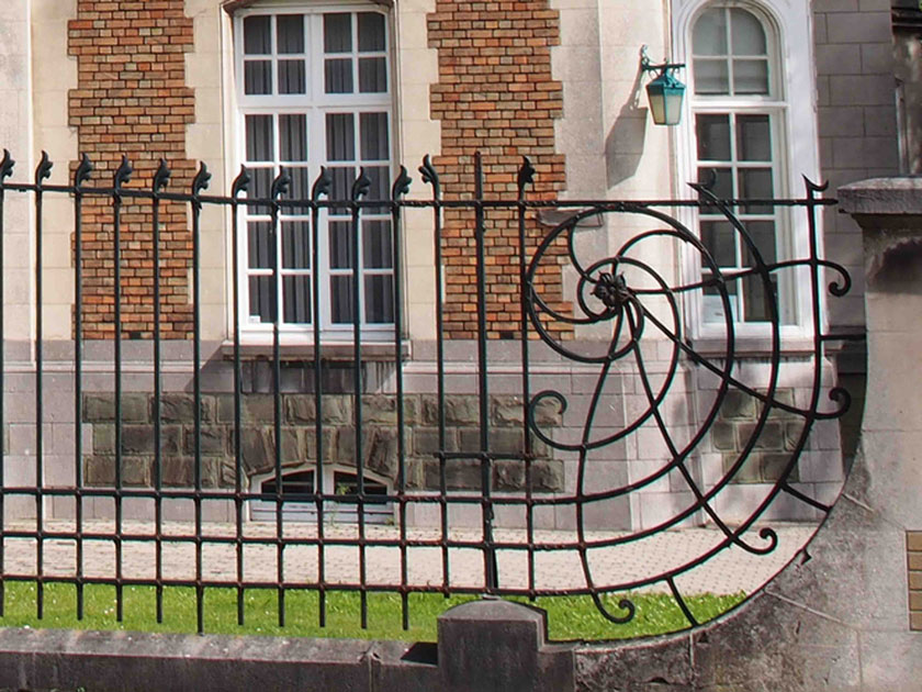 ロートアイアンのフェンス・格子#007は、カタツムリ、もしくはクモの巣のような、かなり特徴的なデザインがかなり大きく大胆に描かれているのが真っ先に目に入る、他ではまず見たことのない世界にただひとつだけのオリジナルな世界観が印象的なフェンスです。