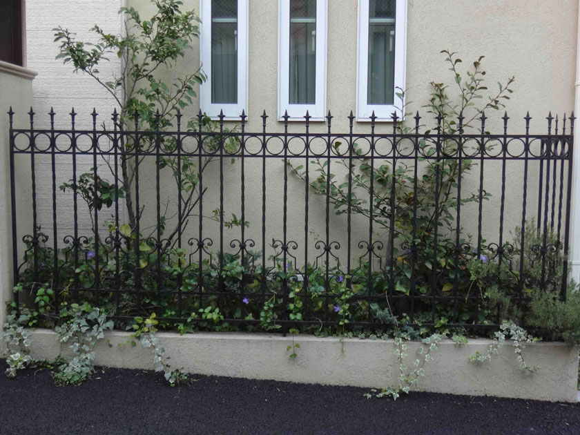 また、お洒落なヨーロッパの雰囲気でありつつも大人しい佇まいに抑えたロートアイアンのフェンス・格子であれば、ベースとなる邸宅・店舗のデザインや、外構・エクステリアのデザインを邪魔することがありませんので、なるべくフェンスの存在感を抑えて他を目立たせたい時などにも、とても重宝すると思います。
