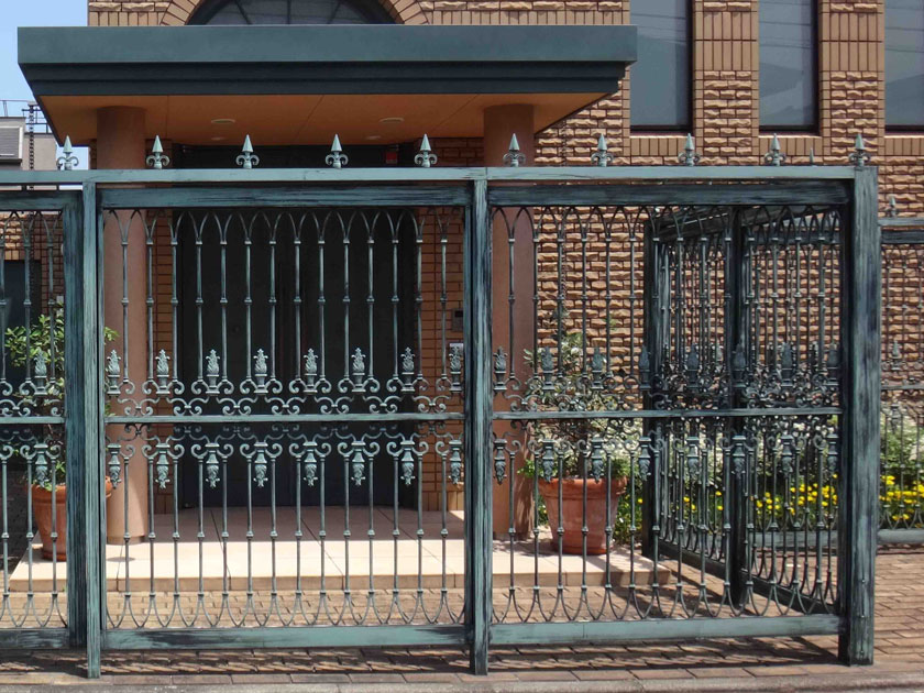 ロートアイアンのフェンス・格子#011は、縦格子をベースにしたシンプルなデザインに、一定のパターンで小気味よく伝統的な装飾柄を並べた、どこともつかない興味深い着地点で、逆に言えば何にでも合わせられるデザインに仕上がっったフェンスです。