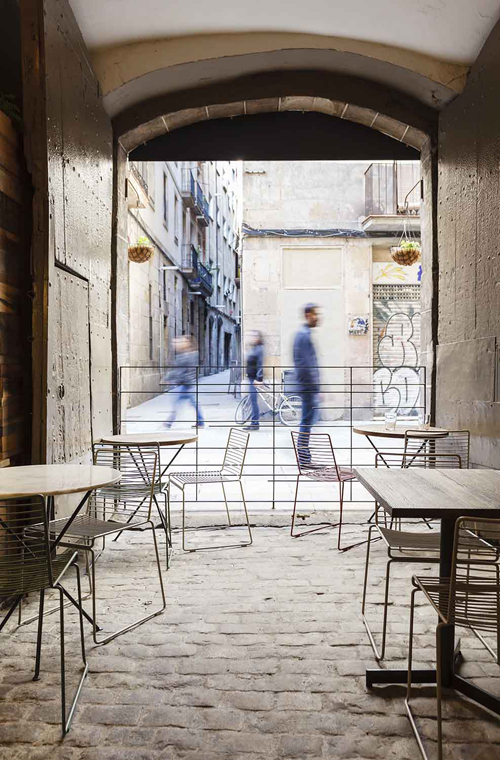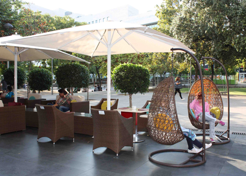 雨が少ないといいましたが、バルセロナではたまに豪雨もあるんですよ。この人工ラタンは防水で、さらにお掃除もしやすいので、バルセロナには多くの場所で見ることが出来ます。