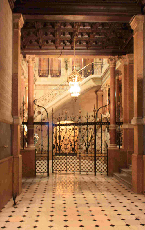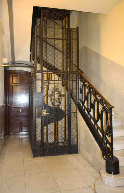 この入口は、奥に古い形式のアイアンのエレベーターが設置されています。