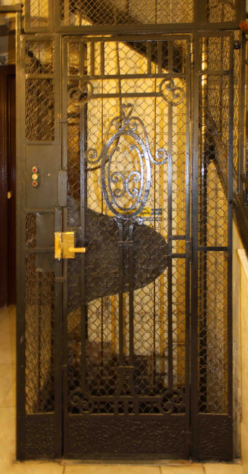 この旧式のエレベーターには、ロートアイアンの装飾がされているケースが多いです。