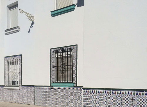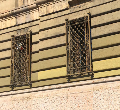 建物の入口付近にはタイルの装飾がされ、窓も珍しく、円形をしてます。同じ側面に大きな窓もあり、泥棒からの防御としてアイアンの柵があります。