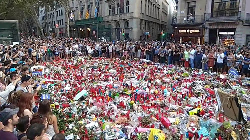 後にラ・ランブラスの中心にあるミロの絵画の所には沢山の花束、ロウソクが置かれ、追悼する方で多くの方が集まりました。