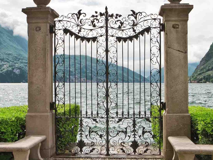 ロートアイアンの門扉・門・ゲート#001は、ロートアイアン伝統の代表的な定番デザインのひとつ、植物のツタをモチーフにした装飾と、葉の装飾を随所にエレガントに組み合わせて、とてもお洒落で、瀟洒で、気品に満ちた、オリジナリティ溢れる世界観を演出しています。