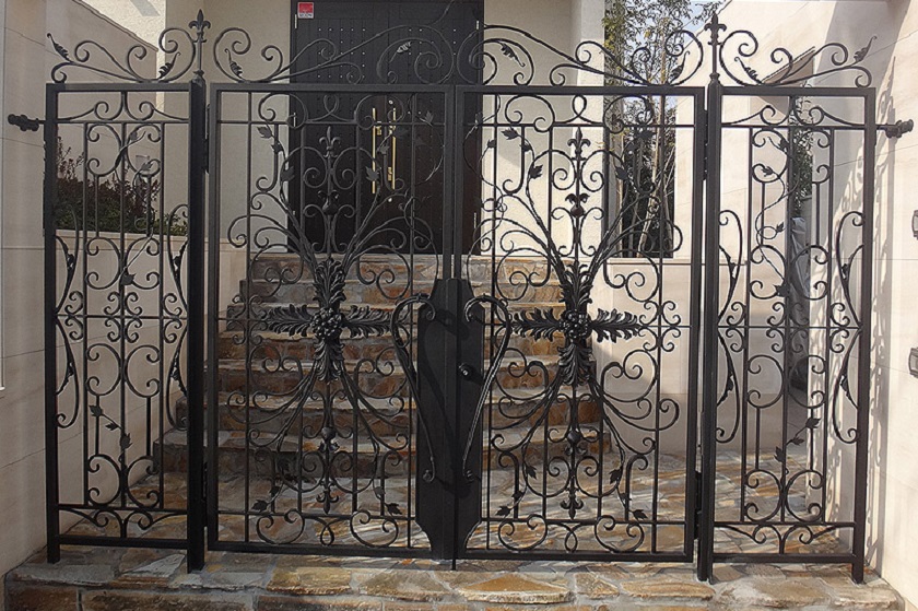 ロートアイアンの門扉・門・ゲート#006は、ロートアイアン伝統の代表的な定番柄のひとつ、植物のツタをモチーフにした装飾と、葉の装飾をエレガントに組み合わせたものです。しかし、#001と同様に縦格子をベースにしても、その上から装飾を全体に配置してみると、全くイメージが変わることが興味深いところです。繊細さやエレガントさもさることながら、よりダイナミックな動きや、豪華さが前面に出てきます。