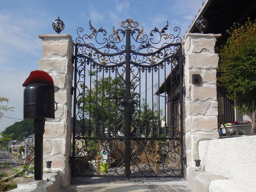 ロートアイアンの門扉・門・ゲート#010は、ロートアイアン伝統の代表的な定番デザインのひとつ、植物のツタをモチーフにした装飾と、葉の装飾を随所にエレガントに組み合わせて、とてもお洒落で、瀟洒で、気品に満ちた、まるでヨーロッパの高級リゾートのような雰囲気を創出しています。