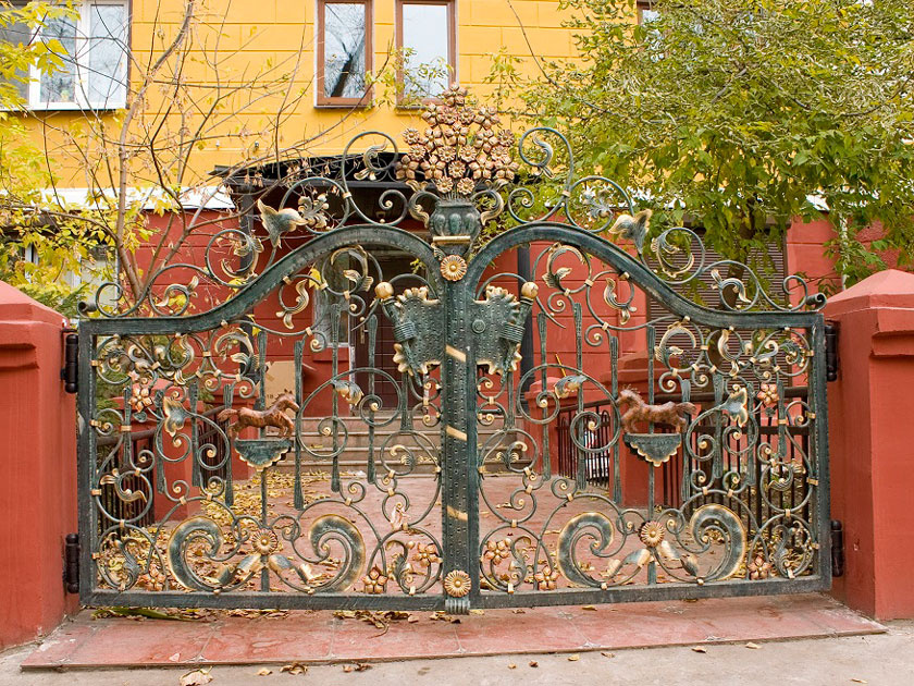 ロートアイアンの門扉・門・ゲート#015は、トップエンブレム自体を豪華な花瓶に入った花束をできるだけリアルに表現し、その豪華さ、派手さ故に、それが門扉(門・ゲート)全体のデザインのテーマとなった、なかなか他では見たこともないような、オリジナルな世界観を誇っています。