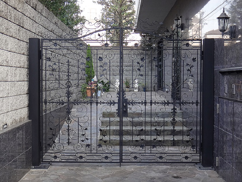 ロートアイアンの門扉・門・ゲート#103は、ロートアイアン伝統の代表的な定番柄のひとつ、植物のツタをモチーフにした装飾と、葉の装飾をエレガントに組み合わせたパターンを、全体をフレームで3分割して軽快に配置した、華やか、かつエレガントでもあり、上品な気品も感じさせるデザインの逸品です。