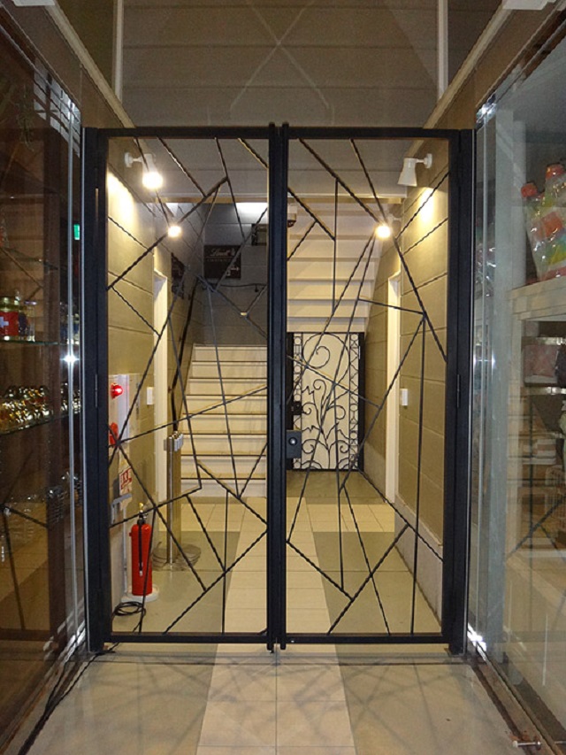 ロートアイアンの門扉・門・ゲート#110は、装飾をほとんど排した非常にシンプルなデザインの極め付けです。全体を大きなオリジナルアレンジの幾何学的な模様でデザインした、モダンでアーティスティックな柄です。ここまでのシンプルモダン柄ですと、もはや通常の鉄骨工事の域ですが、もちろん対応します。