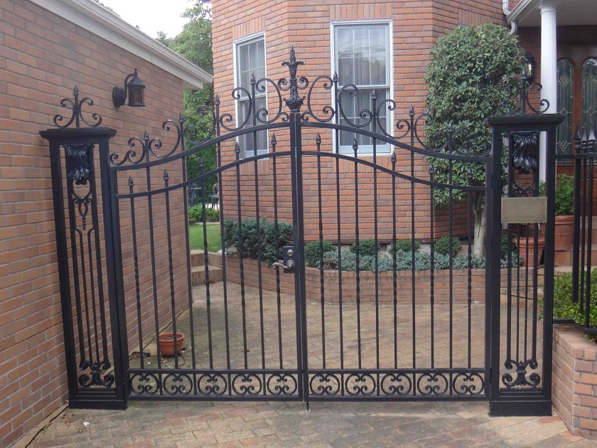 ロートアイアンの門扉・門・ゲート#113は、ロートアイアン伝統の代表的な定番デザインのひとつであり、非常にシンプルな縦格子をベースに、トップには剣先の装飾が並び、その間や下端を植物のツタをモチーフにした装飾が控え目に配置されています。トップのラウンドが、かなり重要な役割を担っています。