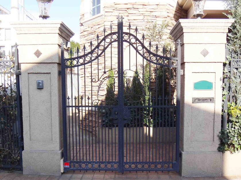 ロートアイアンの門扉・門・ゲート#114は、ロートアイアン伝統の代表的な定番デザインのひとつであり、非常にシンプルな縦格子をベースに、トップには剣先の装飾が並び、上下端のフレームの間には、円の装飾が控え目に配置されています。今回は中央部の格子柄を抜いて、軽快な動きのエンブレム的な装飾を配置していますが、それだけの変化でも、かなりオリジナルな存在感を主張していて、お洒落です。