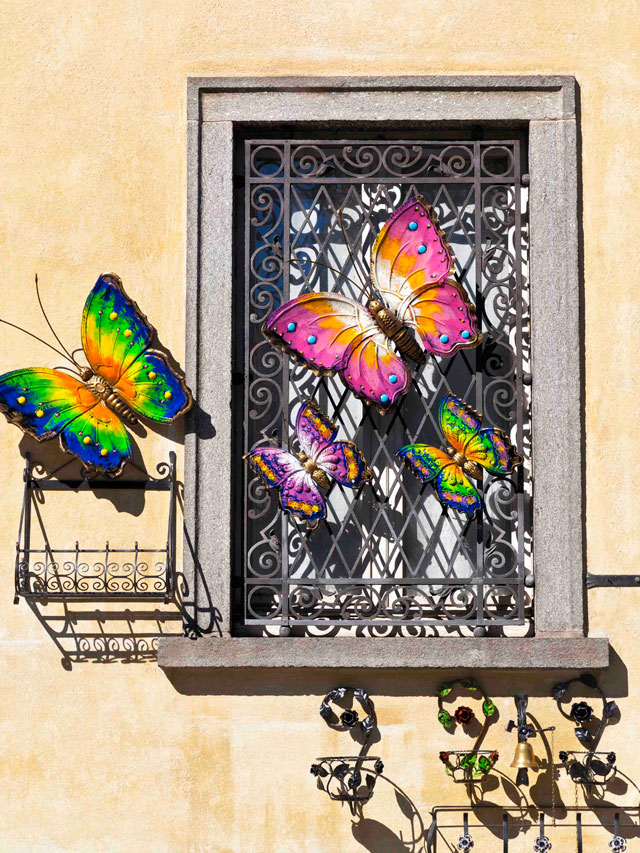 特筆すべきは、そこに留まる3羽の大柄な蝶モチーフの装飾です。あまりにリアルなため、ともすると不気味にもなりかねないところを、鮮やかな特殊塗装にすることによって、華やかさを前面に押し出し、他には無いオリジナリティを見事に表現した面格子に仕上がりました。まさに、これぞオーダーメイドの神髄といえます。