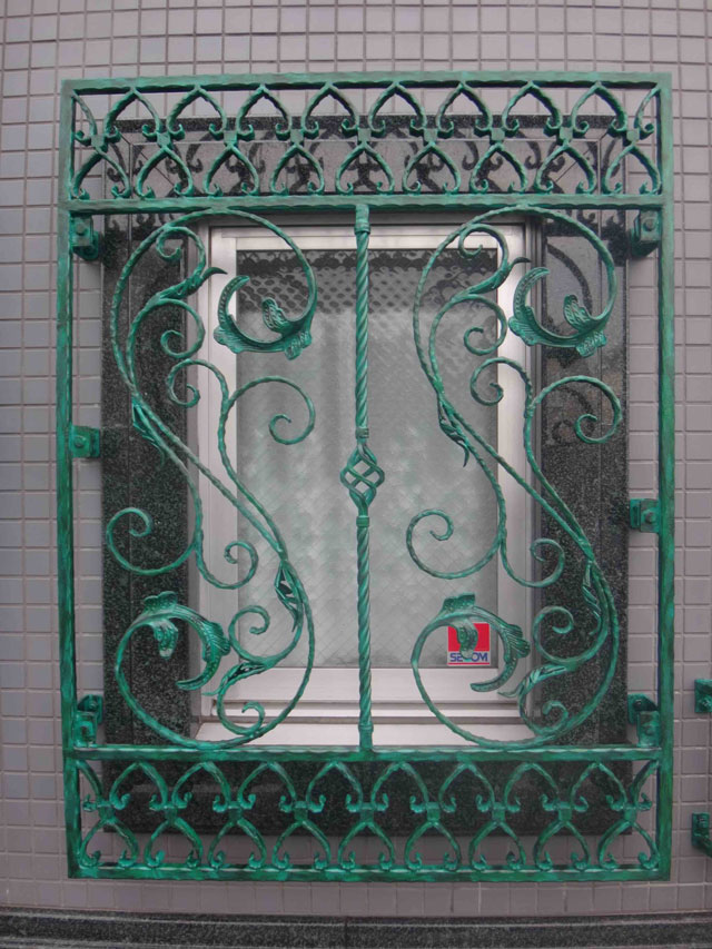 特筆すべきは、華やかな緑の上に、黒や濃い緑を重ねた、4層にも及ぶヴィンテージ加工の緑青色です。この複雑にも美しい色合いが、新しい面格子であっても浮くことなく、既存の建物や草花、植栽などと最初からマッチし、リフォーム・リノベーションにもお勧めの手法と言えます。