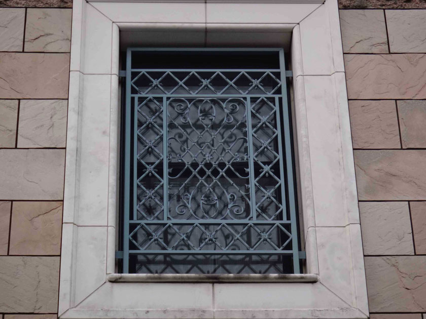 ロートアイアンの面格子・ラティス#006は、斜めの格子柄をベースにして、中央部にシンボリックなエンブレムのようにデザインされた面を配置し、四方に枠取りしたようなパネル割りをすることで単調さを打ち消して、豪華さや格式を演出することに成功した、ロートアイアン伝統のエッセンスが感じられる逸品です。